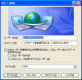 - ユ−ザ−名:ユ−ザ名@isdn.kip.ne.jp