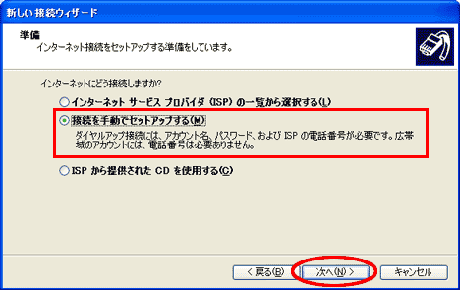 [接続を手動でセットアップする]にチェックを入れ、[次へ]をクリックします。