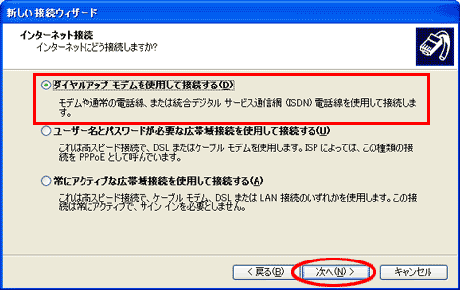 [ダイヤルアップモデムを使用して接続する]にチェックを入れ、[次へ]をクリックします。