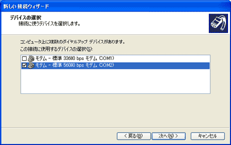 ※インストールされている通信機(モデム・TA)が1つだけの場合は、[デバイスの選択]の画面は表示されません。