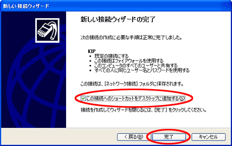 ※デスクトップへ接続アイコンを表示させる場合は、[この接続へのショートカットをデスクトップに追加する]をチェックします。