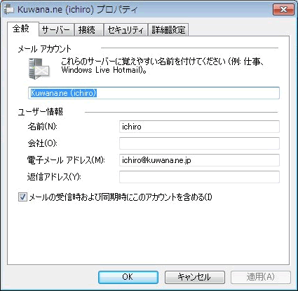 - ウイルスチェックサービスの場合:ユーザ名@mail.kuwana.ne.jp(例:ichiro@mail.kuwana.ne.jp)