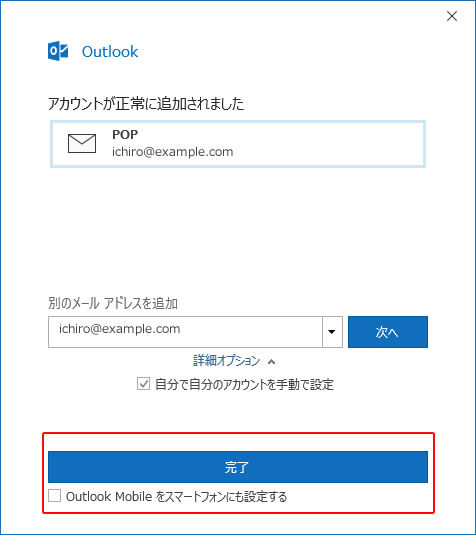 6.[OutlookMobileをスマートフォンにも設定する]のチェックを外し、[完了]をクリックします。